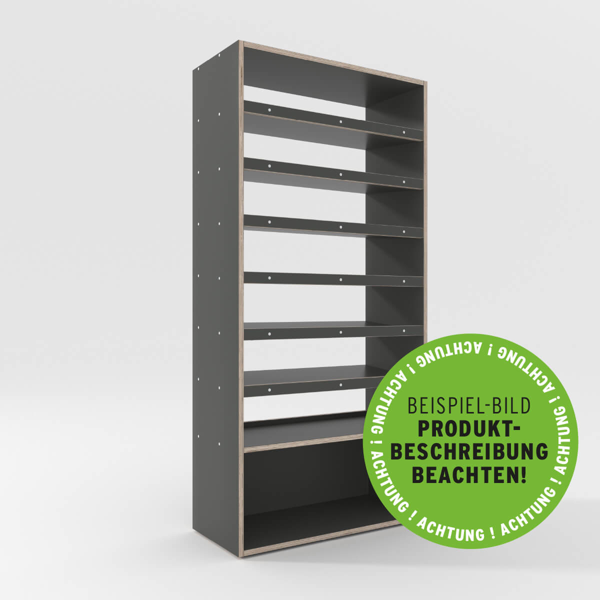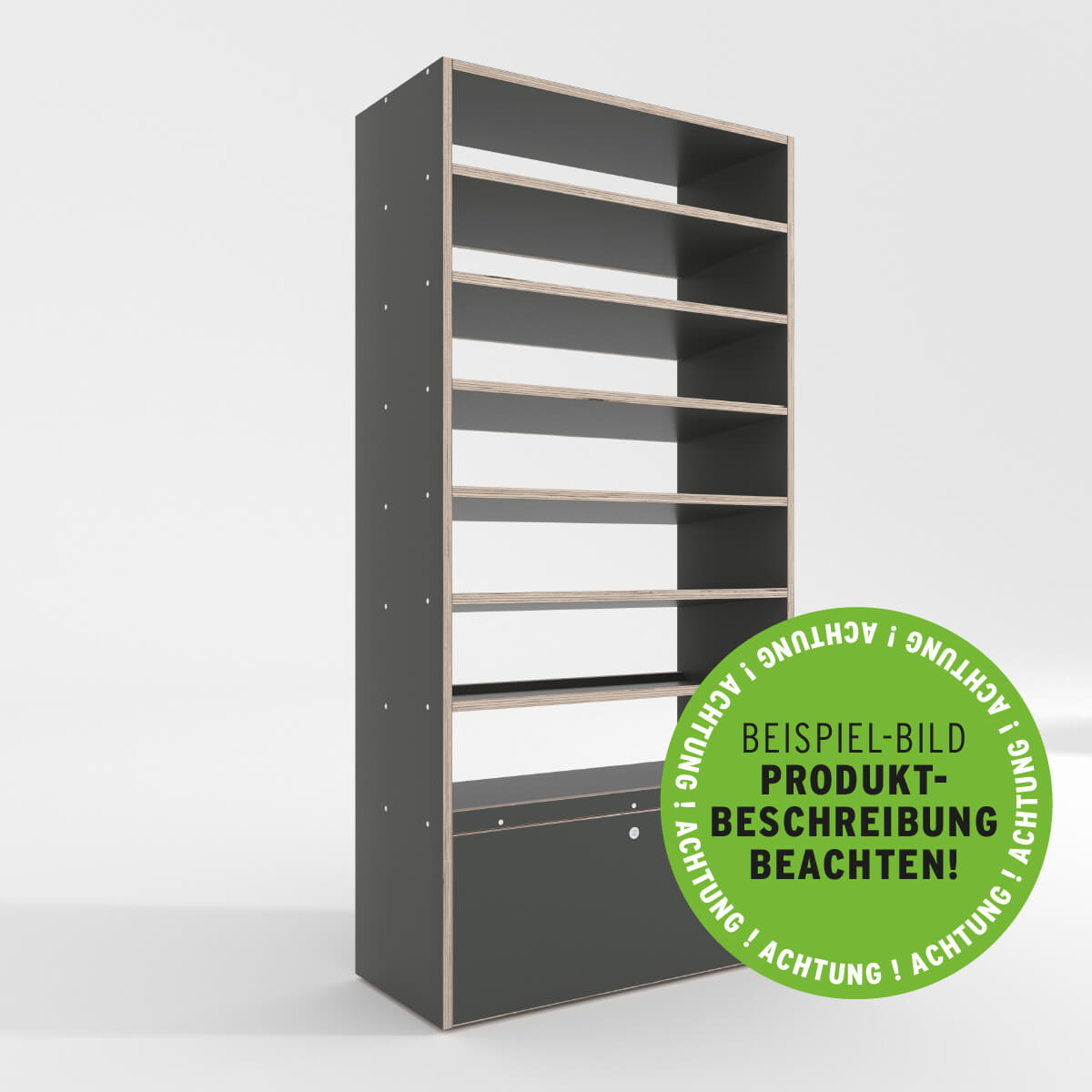 mit nach unten zu öffnender Türklappe im untersten Segment (35 cm hoch, mit Druckknopf-Verriegelungsschloss) und sechs in der Höhe variabel platzierbaren, 5° nach hinten geneigten Zwischenböden (perfekt als Schraubenregal nutzbar). Der Regalboden über der Türklappe ist nicht geneigt und mit einer Frontblende versehen, alle geneigten Regalböden sind ohne Frontblende, dafür mit einer Blende auf der Rückseite verbaut. FlexRexx 65 ist besonders für flache Werkzeugkoffer von Makita, Bosch, Hilti, Milwaukee etc. geeignet.
